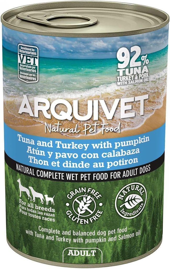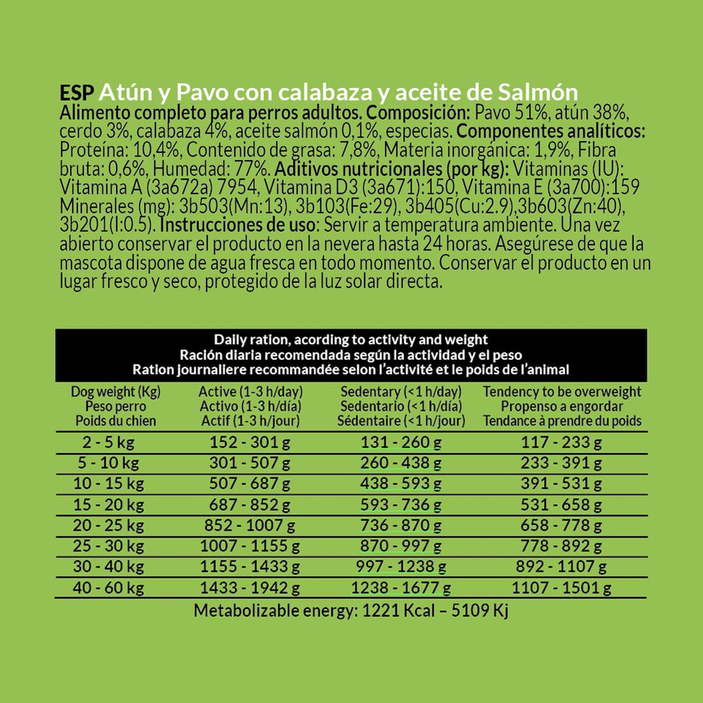 Alimento húmedo completo para perros de todas las razas. A base de atún y pavo con calabaza. Ingredientes 100% naturales. Recetas nutricionalmente equilibradas formuladas por veterinarios y nutrólogos. Cocinadas a fuego lento para preservar todos los elementos nutritivos. Un superpremium para perros adultos con un 92% de carne. Sin colorantes, conservantes ni sabores artificiales. Sin cereales. Sin carne procesada ni harina de huesos.